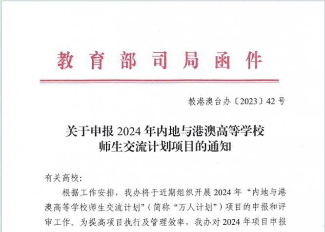 近日,教育部下发《关于申报2024年内地与港澳高等学校师生交流计划项目的通知》,威尼斯官网获批成为2024年内地与港澳高等学校师生交流计划项目申报院校。