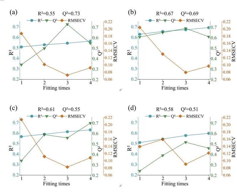 Figure 3. PLSR results of (a) RC, (b) RM, (c) REP, and (d) Cv.